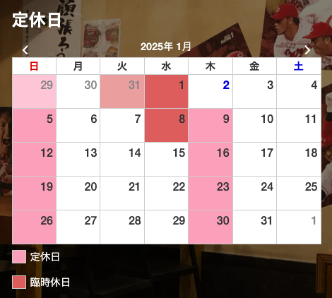 2025年1月の休日のお知らせ 2025 1/02 未分類 当面の間、お昼のみの営業となります。 1月からの営業は、日曜・木曜が定休になります。どうぞよろしくお願いします。 未分類 この記事が気に入ったら いいね または フォローしてね! Follow @doakaoni Follow Me よかったらシェアしてね! URLをコピーしました! 12月1月(年末年始)の営業日を更新しました。 4月5月(ゴールデンウィーク)休みのお知らせ 関連記事 おおおおお あああああ 実験3種 4th だああ jpg投稿 45月カレンダー 4月5月のお休み